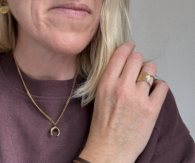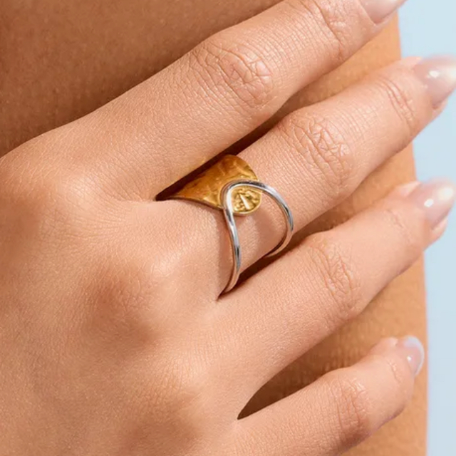 A gorgeous simple statement ring crafted from stainless steel. This is a chunkier design with beautiful curves in silver and gold tones. The gold section has a hammered effect finish to add extra interest and catch the light. Comes packaged in a gold and black velvet gift pouch.