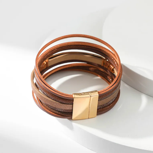 Get an instant layering effect with this stunning multi layered wrap bracelet! Beautiful shades of chocolate toned strands and sparkly rope strands are complemented by an eye-catching hammered effect gold plate. Easy to put on in a rush too with a gold magnetic clasp. Comes packaged in a black velvet and gold gift pouch.
