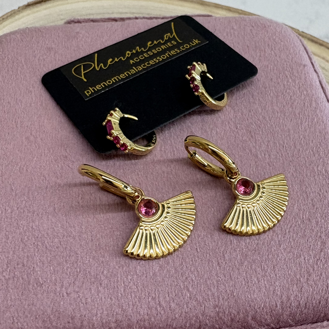 Brighten up your day with these eye catching Stainless Steel Huggie Hoop Earrings. The earrings have a hinged gold plated Stainless Steel hoop that clicks securely into place and boast a stunning removable fan shape pendant with a sparkly rose stone. They are packaged gift-ready in a small gold and black velvet pouch.