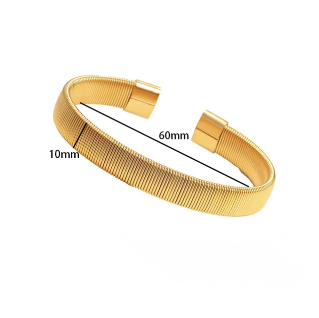This simple style flexible open cuff will make a great addition to your jewellery collection. Crafted from silver plated stainless steel with a fine stripe effect, this waterproof bracelet is a simple, stylish and easy-to-wear piece. Please check your wrist measurements to ensure a good fit. It comes packaged in a black and gold velvet gift pouch.